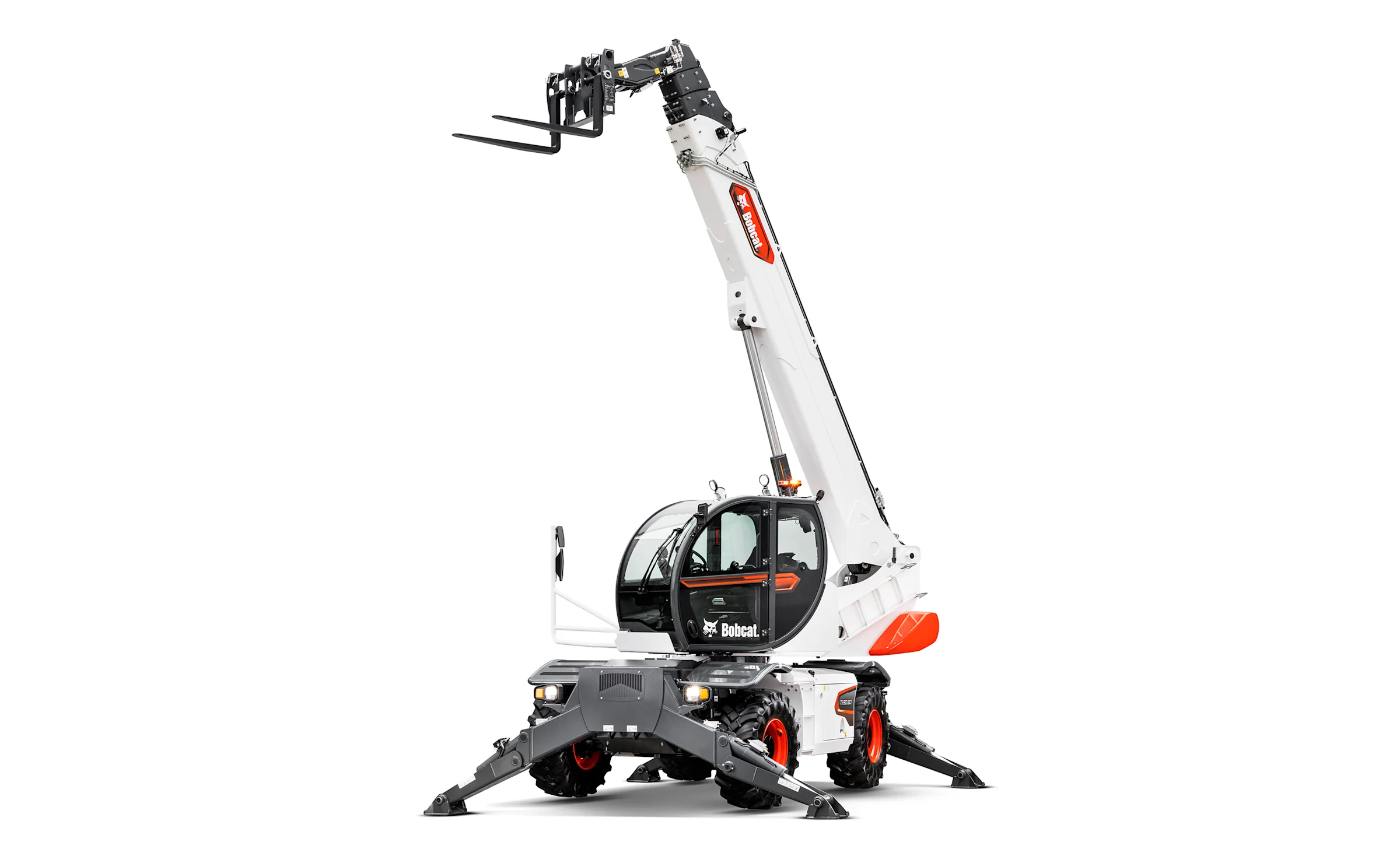 The Bobcat TR50.180 is a versatile rotary telehandler designed for construction sites and for-hire fleets. It is compact and multifunctional, equipped with pivoting stabilizers and a load monitoring system for safety. Thanks to the RFID system, it effortlessly recognizes attachments, while its three steering modes offer flexibility for various applications in construction.